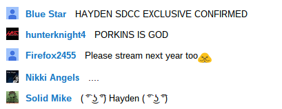 On Day 2, the Ray Park panel was getting ready to start, and like on a 24 hour news channel, time desperately needed to be filled. As everyone was waiting for Park to arrive, there was some weird Star Wars Angry Bird audience game where they had audience members tossing bird plushies on stage to try to knock down objects. The host picked out this kid named Hayden from the crowd to participate, and for whatever reason the live stream chat became obsessed with him. For the entire rest of the weekend, at least 1 in every 7 messages in the chat was Hayden related, with YouTube users writing “WE WANT HAYDEN” or “HAYDEN CONFIRMED FOR BATTLEFRONT” or claiming to see Hayden in the background in random shots.